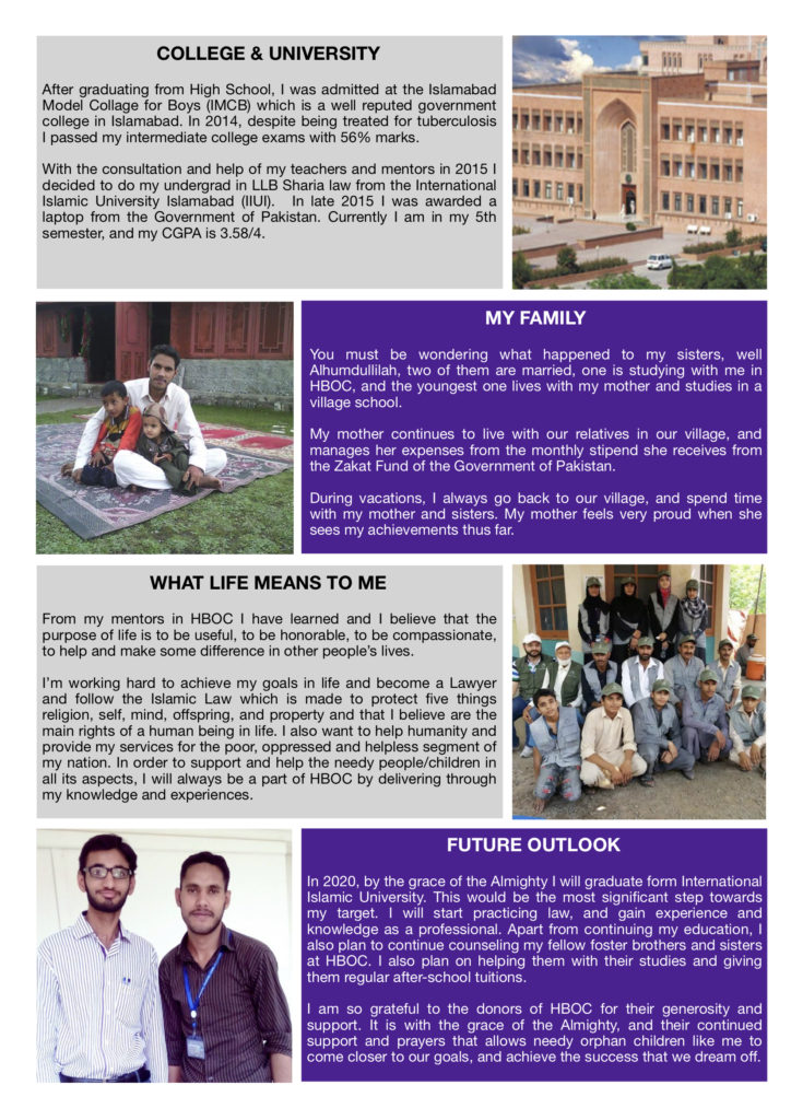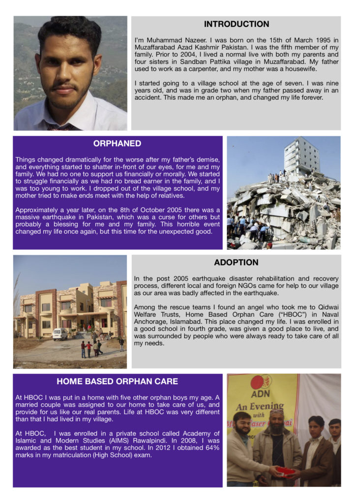 Muhammad Nazeer is an orphan that joined Qidwai Welfare Trust’s orphan homes back in 2006. Over the past 12 years Nazeer has successfully completed his middle-school, high-school and college, and is currently pursuing his under-graduate studies in LLB Sharia law from the International Islamic University Islamabad (IIUI). He is expected to graduate in two years, in 2020. This is his story in brief :-